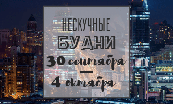 Город приготовил множество интересных событий с 30 сентября по 4 октября, которые помогут будням пройти ярче и быстрее. Если вы до этого момента не знали, чем себя занять — сейчас этот вопрос закроется. Мы выбрали мероприятия на каждый день недели для тех, кому лень отправляться на поиски самостоятельно.