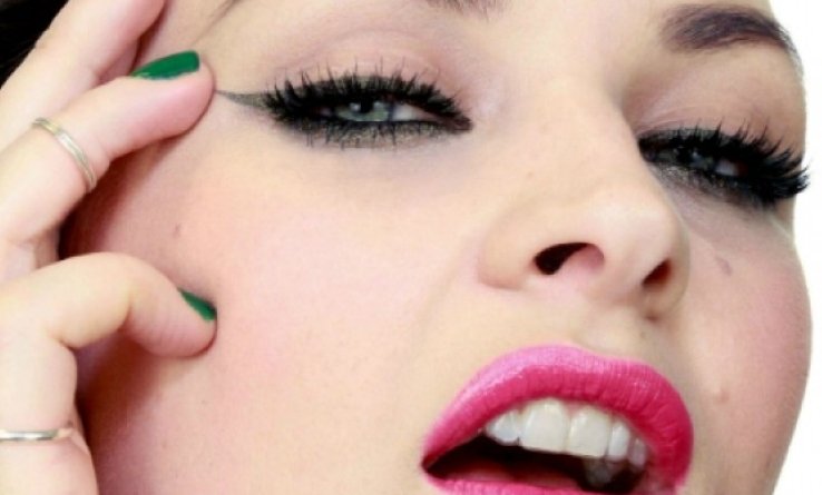 Сделайте широкие, но аккуратные стрелки. Модель подобрала очень удачный цвет - темно-зеленый. Так макияж глаз будет выразительным и не слишком темным. Подберите оттенок карандаша для глаз соответственно подводке и сделайте массивную линию вдоль нижней линии ресниц.