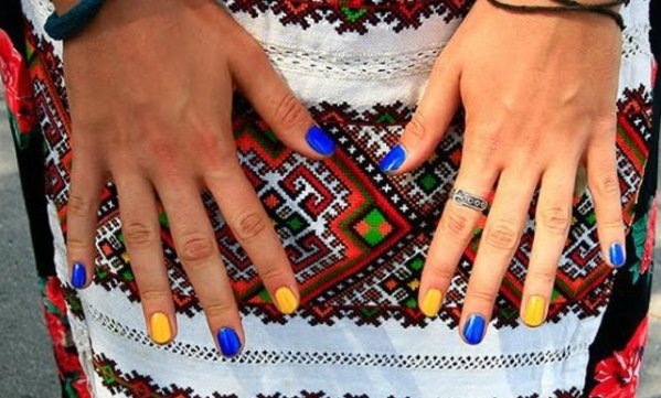 Еще одна идея — сделать патриотичный маникюр желтым на одной руке, и синим — на второй. Как вариант — французский маникюр в желто-голубом исполнении. Также можете сделать модный маникюр омбре в желто-голубой гамме или сделать акцент с глиттером в этом же цветовом решении. Самые патриотичные могут одеть свои ноготки в вышиванку или сделать "вышитый" акцент на одном ногте.