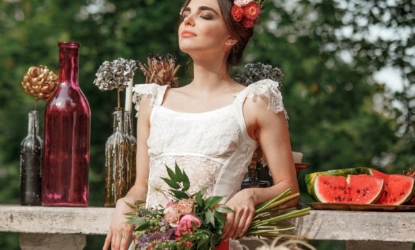 Сейчас очень популярны вещи в так называемом бабушкином стиле. Это блузки с рюшами, воланами, воротничками, платья с объемными рукавами, вышивкой, кружевными вставками. Для летней свадьбы платье в таком стиле может стать очень хорошей идеей. Дополняйте образ обувью, аксессуарами и другими деталями из натуральных материалов.