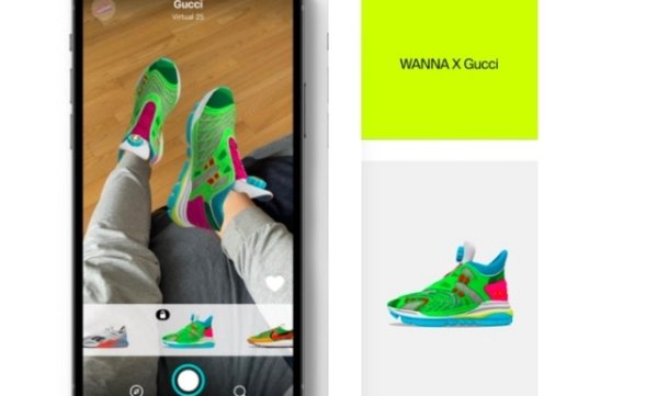Модный Дом Gucci и белорусский AR-бренд Wanna представили свое первое совместное творение — виртуальные кроссовки ярко-зеленого цвета с розовыми и голубыми элементами.