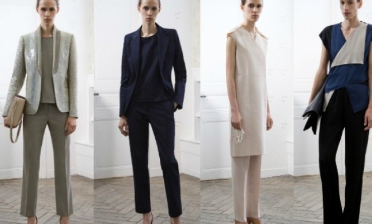 Простые топы и блузы, идеально скроенные брюки и прямые платья – все представлено в ясных чистых цветах: белый, черный, серый, светло-лавандовый, голубой, синий и телесный.