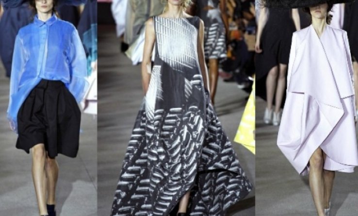 Основа коллекции - архитектурный объем. Платья, пальто, брюки, юбки и даже шляпы - все отличалось особой скульптурностью.