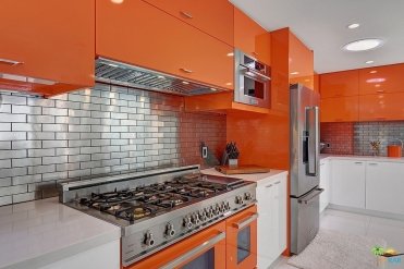 Если вы выбрали оранжевую мебель для кухни, удачным сочетанием станет серый глянцевый кухонный фартук и такой же холодильник. Подходит также белый цвет и контрастное сочетание белого с черным.