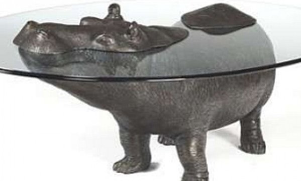 Шотландский скульптор и дизайнер Марк Стоддарт говорит, что его столики предназначены для домов, в которых любят животных и не стыдятся оригинальности. Каждый зверь исполнен в двух частях. Нижняя – основа столика – часть животного якобы скрытая под водой. И верхняя – крепеж столешницы – морда бегемота, выныривающая прямо из центра стола. Благодаря стеклянной столешнице возникает иллюзия того, что бегемот позировал автору в момент купания.