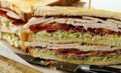 2. Намажьте половину ломтика хлеба горчицей, положите на горчичную половинку по ломтику сыра и по полтора ломтика индейки. Накройте начинку второй половинкой хлебного ломтика и скрепите бутерброд шпажкой.