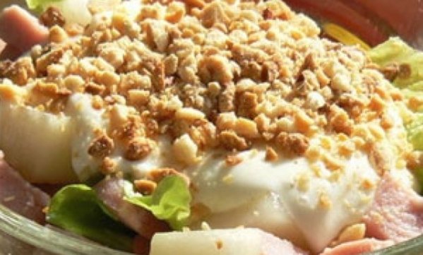 Смешайте ветчину, груши, чеснок и салат. Полейте салат соусом, посолите и поперчите, а сверху посыпьте орехами.