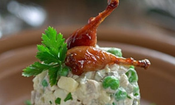 Привычный оливье может стать настоящим украшением праздничного стола, если добавить в него немного "парижского шика". Посмотрите на ножки этих перепелок - гастрономическое кабаре!