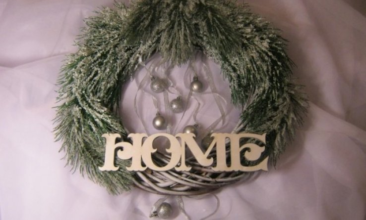 1.Для создания новогоднего венка нам потребуется: ветки искусственной сосны – 10-12 шт., серебристая лента, небольшие новогодние шарики, декоративная проволока серебристого цвета, деревянная заготовка слова «home» (вы можете выбрать любое другое, купить заготовку можно в художественном и творческом магазине), основа для венка из лозы, краска-спрей белого цвета, клей ПВА, кисть, декоративный снег.