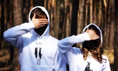 Примечательно, что вместо смокинга и свадебного платья ребята выбрали белые толстовки, джинсы и кеды. Незаменимым атрибутом (особенно сейчас, во время карантина) стали черные защитные маски.