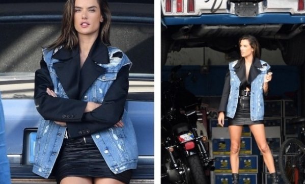 Перед камерами звезда подиумов появилась в соблазнительном образе. Амбросио примерила узкую кожаную мини-юбку и пиджак на голое тело. Дополняли ее look джинсовая жилетка и черные кожаные сапоги с ремнями.