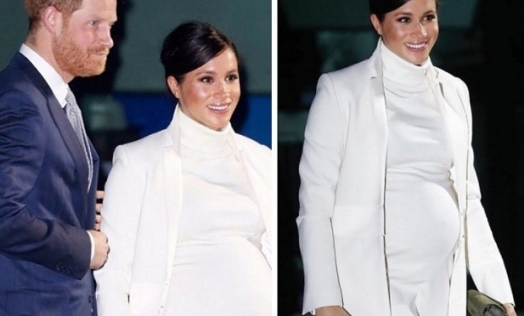 Для светского выхода Меган выбрала образ total white — белоснежное платье с воротником-стойкой от Calvin Klein и пальто от Amanda Wakeley.