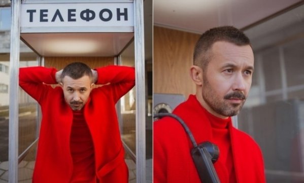Первое, что бросается в глаза, — это яркий образ артиста — total red выделяет Бабкина на фоне светло-серых декораций пространства, куда он помещен вместе с телефонной будкой, возле которой и происходит все действие.