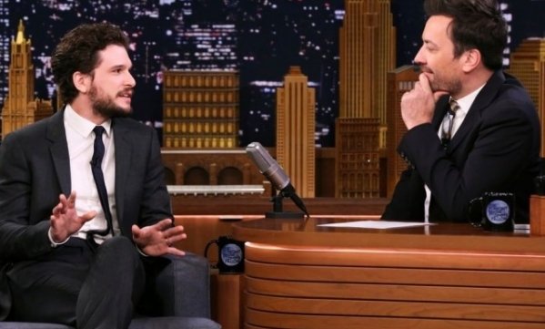 Ведущий попросил актера прокомментировать слухи о финале и подмигнуть. При кадре Джона Сноу с мечом на снегу и спросил, означает ли это смерть его героя. На что Харингтон отрицательно моргнул. Далее Фэллон поинтересовался, умрут ли все персонажи, — Кит также ответил отрицательно. И последний вопрос ведущий задал, показав кадр, где Джон Сноу стоит перед драконами. "Джон Сноу полетит на драконе?" — спросил Фэллон, на что снова получил от Харингтона отрицательный ответ.