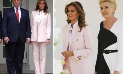 Каждое появление на публике Мелании Трамп всегда вызывает ажиотаж. Обычно она делает акцент на женственности и выбирает платья. Но для встречи гостей из Польши Мелания сделала ставку на нежно-розовый, пудровый костюм Calvin Klein, состоящий из удлиненного жакета и брюк с завышенной талией. Также образ дополнили белая рубашка и кремовые лодочки.