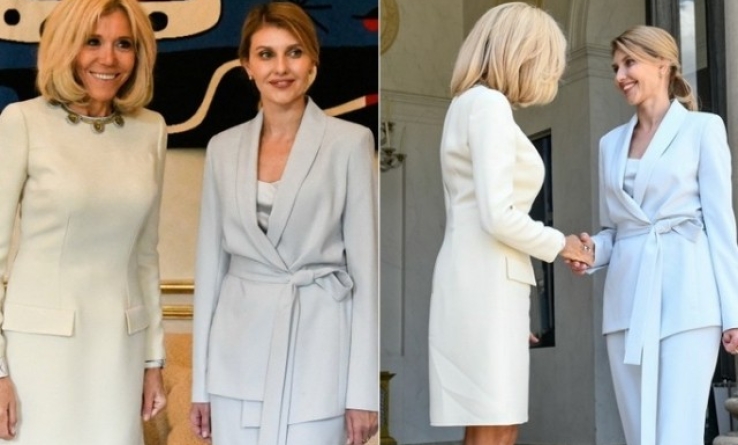 Бриджит Макрон для встречи выбрала наряд в пастельных цветах. Образ дополнили серые лодочки и красиво уложенное удлиненное каре. А Елена Зеленская надела небесно-голубой костюм из прямой миди-юбки и пиджака с длинным поясом, а дополнила свой look классическими бежевыми лодочками.