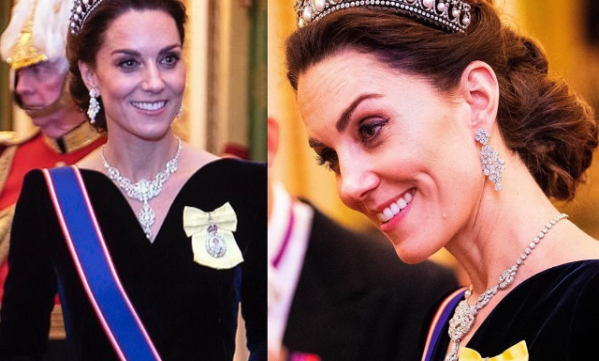 Для нового выхода в свет Кейт Миддлтон надела красивейшее платье от Alexander McQueen. Из украшений была тиара "Узелки любви" (Cambridge Lovers Knot), которую королева подарила принцессе Диане на свадьбу с принцем Чарльзом. Также герцогиню украшал Викторианский орден, который королева присвоила Кейт на восьмую годовщину ее свадьбы с принцем Уильямом.