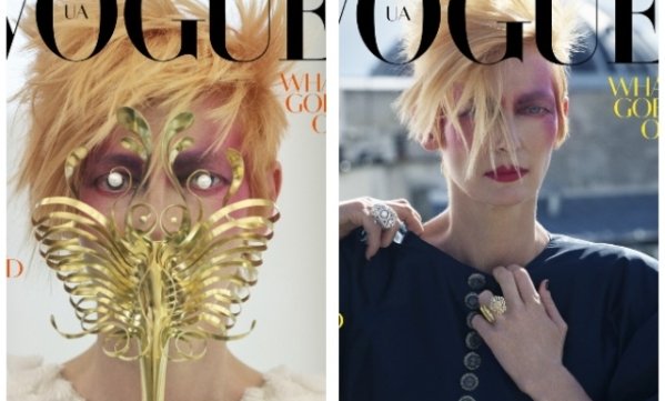 На одной из обложек Тильда Суинтон позировала в белоснежном платье с оборками и золотой маске, в которой она ранее появилась на красной дорожке Венецианского кинофестиваля.