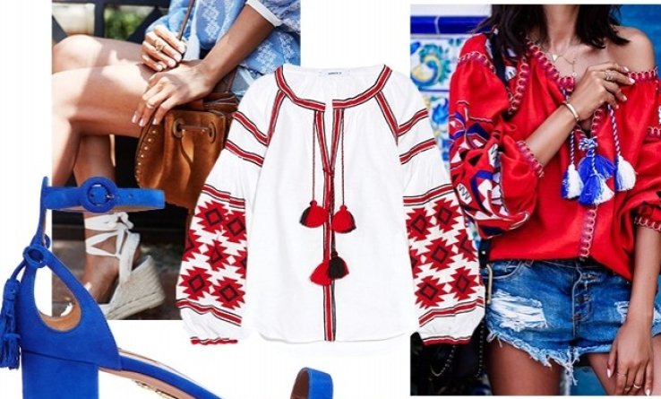 Проще всего, конечно, приспособить недорогую вышиванку к летнему и курортному гардеробу. Все эти летящие блузы, туники и платья нараспашку прекрасно сочетаются с короткими джинсовыми (и не только) шортами, купальниками – у бассейна или на пляже платье-вышиванку можно носить в качестве пляжной накидки, модными летними шляпами(например, канотье, классической федорой или широкополой соломенной шляпой), плетеными сумками-корзинками, многочисленными украшениями в стиле бохо и т.д.