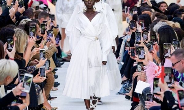 Так, открылся показ чередой белоснежных образов: просторные платья рубашечного типа с плиссированной юбкой, топы в идеальном сочетании с прозрачными юбками, хлопковые смокинговые рубашки, получившие необходимую длину, чтобы превратиться в платья для вечеринки. Из аксессуаров: ремни-канаты, обувь в стилистике поясов и белые сумки-тоут, украшенные перьями марабу.