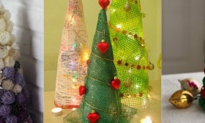 Для создания елки вам понадобятся скотч, конфеты и гирлянда. Из полоски скотча и конфет вы можете сделать своеобразную гирлянду, которой просто аккуратно обматываете бутылку шампанского, а потом еще дополнительно украшаете ее дождиком. Преображать также можно и другими способами. Например, можно обклеить бутылку скотчем, а потом крепить на него конфеты! Для деток же можно сделать елочку из бумажного конуса. Он обклеивается двусторонним скотчем, а потом на него приклеиваются конфеты, дождик и красивая макушечка из ленточки.