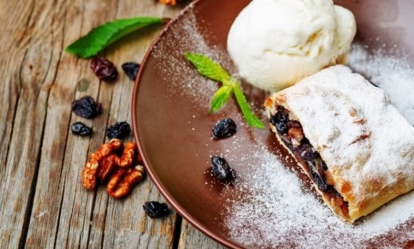 Раскатать тесто в пласт толщиной 2-3 мм. Выложить начинку ровным слоем. Свернуть в рулет, выложить швом вниз на смазанный противень. Выпекать 40 минут при 180*С. За 5 минут до готовности смазать штрудель сливочным маслом и отправить обратно в духовку. Готовый штрудель присыпать сахарной пудрой.