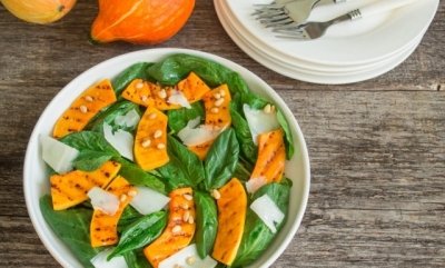 Половину небольшой тыквы, порезать кусочками примерно по 3 см. Смешать тыкву с оливковым маслом, солью и перцем и запекать в духовке при температуре 220 С в течение 20 минут.