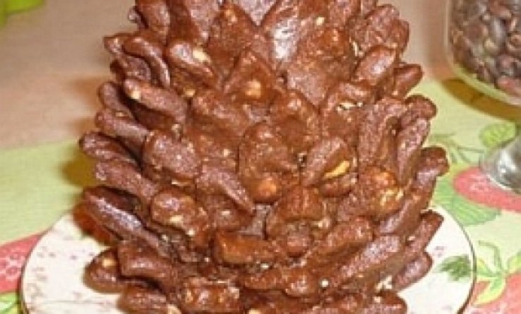 Чтобы изваять шишку придется повозиться немного дольше, зато результат приятно удивит и вас, и ваших гостей. Натрите на терке полкило печенья, добавьте в него банку сгущенного молока. Пачку маргарина или масла растопите с сахаром и добавьте какао. Залейте печенье кремом, перемешайте и поставьте в холодильник. Когда масса слегка остынет, можно приступать к формированию шишки. Из части массы сформируйте основу, а вторую половину используйте для лепестков шишки. Отщипывайте кусочки и лепите чешуйки руками, прикрепляя их к будущей шишке по кругу, начиная с макушки. Готовый торт отправляют в холодильник для застывания.