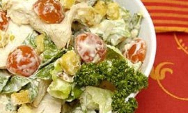 К салатным листьям добавьте куриное мясо,помидоры, половину порции гренок и тертого сыра. Все ингредиенты перемешайте и полейте соусом. Украсьте салат, посыпав его сверху оставшимся сыром и гренками.