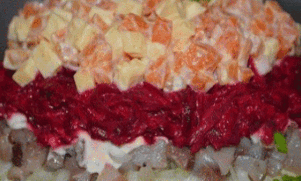 Рыбу почистить и нарезать кубиками. Лук накрошить. Картофель и свеклу натереть, по отдельности перемешать с майонезом, в свеклу добавив давленый чеснок. Морковь и сыр нарезать кубиками и также смешать с майонезом. Теперь выкладывать салат в разъемную форму слоями: картофель, лук, сельдь, свекла, морковь с сыром. Поставить на несколько часов в холодильник. Снять форму, сверху украсить зеленью.