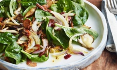Перемешайте в салатнице шпинат с беконом, грибами и луком и заправьте оливковым маслом.
