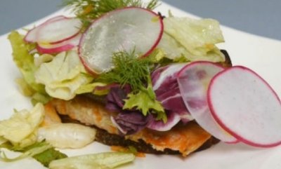 На один ломоть хлеба намажьте баклажанный мусс, сверху выложите лосось горячего копчения и поджаренную спаржу. Второй ломоть смажьте сливочным маслом и накройте им получившийся бутерброд, подогрейте все в духовке.