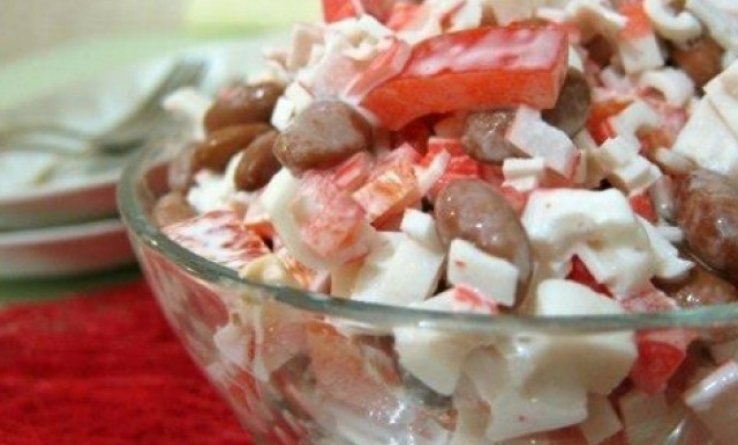 Крабовые палочки и помидоры мелко нарезать. Смешать из с фасолью, добавить чеснок, соль и перец. Полить йогуртом и перемешать.