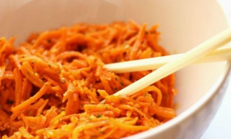 Морковь натереть на крупной терке. Приправить сахаром, посолить и на полчаса оставить. Посыпать перцем красным и черным. Все это перемешать и оставить на десять минут. Затем заправить уксусом и оставить на двадцать минут. В растительном масле обжарить молотую кинзу. И когда она приготовится, ее еще горячую добавить к моркови. Оставить настаиваться десять минут, накрыв полотенцам. Нарезанный лук прожарить в растительном масле. После чего лук достать, а морковь залить горячим маслом. Настаивать десять минут, чтобы блюдо пропиталось ароматами. После чего сюда же выдавить чеснок. Затем морковь нужно оставить настаиваться пять или шесть часов. По истечении этого времени блюдо будет готово.