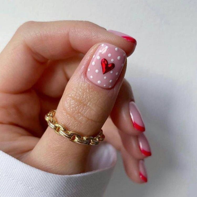 Еще один модный маникюр, который можно смело делать не только на День святого Валентина, но и на каждый день — это белый френч с сердцами и горошком. Такой дизайн ногтей смотрится невероятно нежно и женственно!