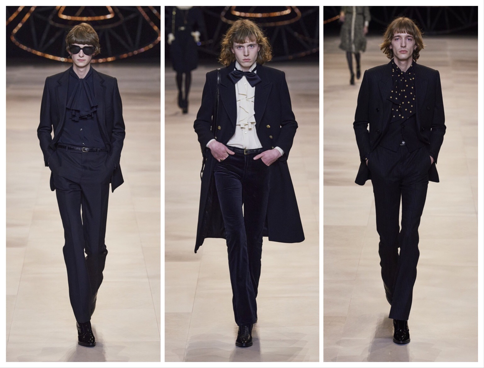 Кружева, розовые банты и рюши — не самые привычные детали в мужском гардеробе. Но в связи стем, что одной из особенностей коллекции Celine было наличие вещей унисекс, мужчины дефилировали по подиуму в костюмах, пальто и рубашках, которые в точности повторяли женские образы.