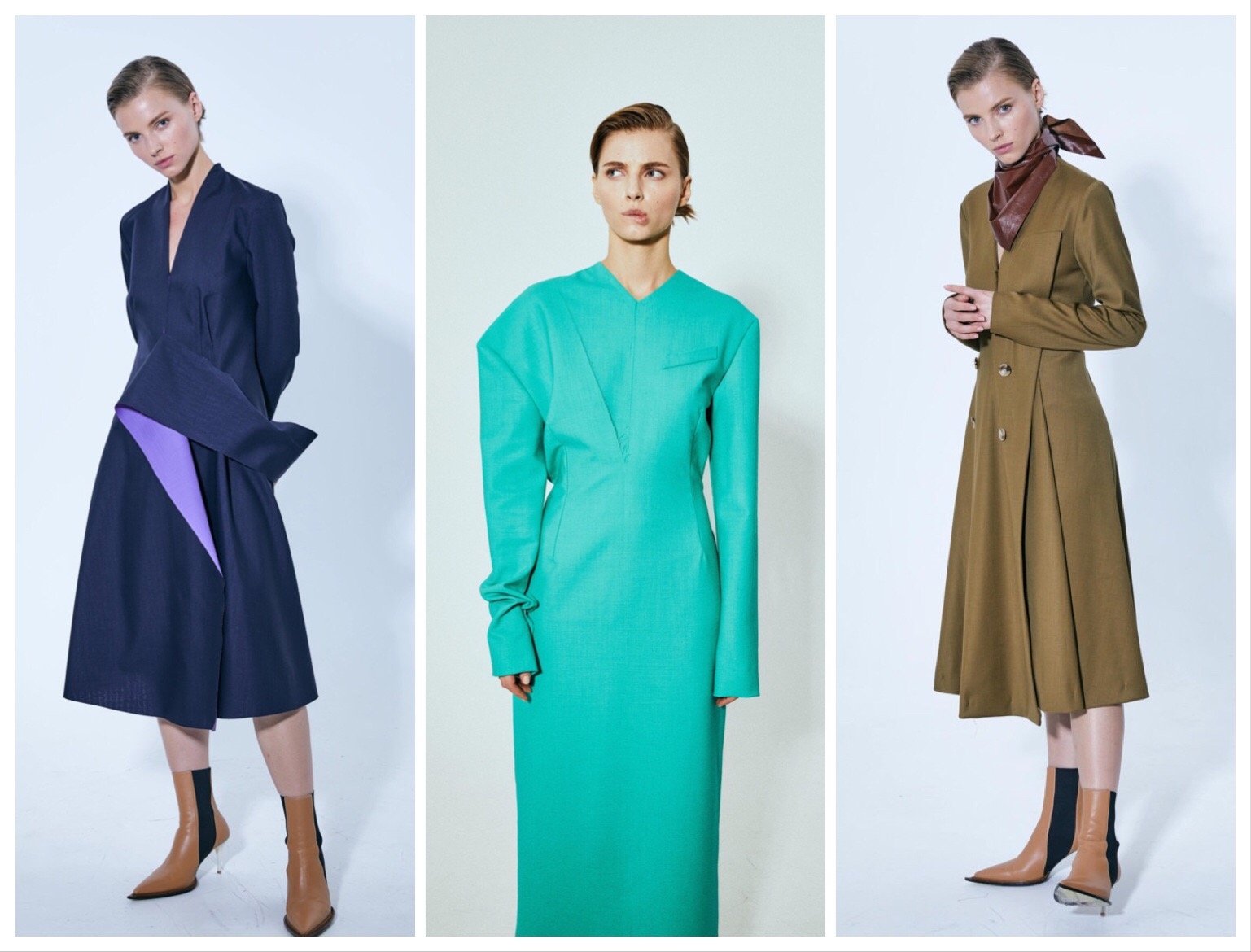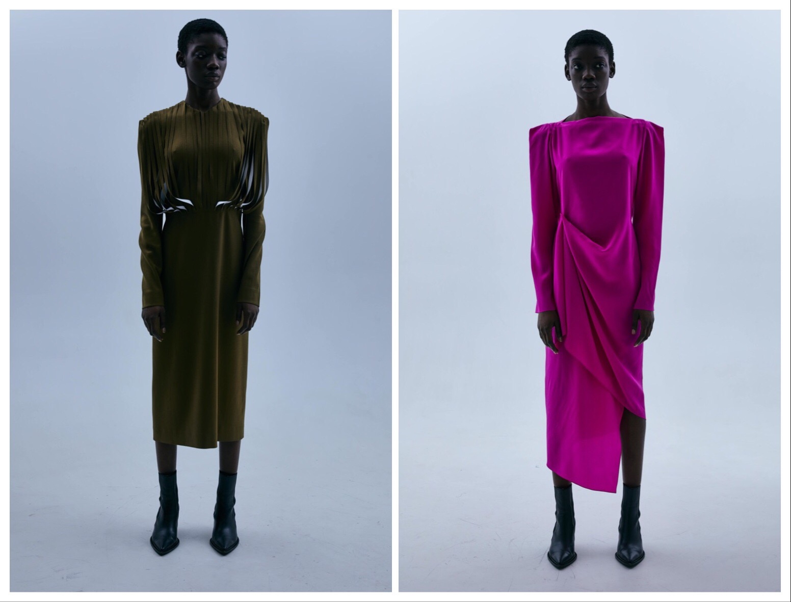 В классическую линейку бренда вошли асимметричные платья, монументальные костюмы, гиперобъемные пальто и юбки-бахрома.