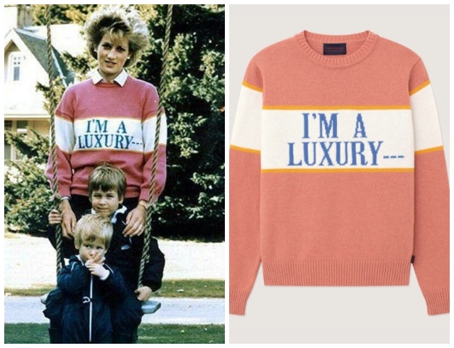 Так, в свет уже вышли точные реплики любимых изделий Дианы: знаменитый шерстяной свитер с овечками и нежно-розовый джемпер со слоганом I'm a Luxury. Кстати, чтобы точно повторить знаменитый принт с овечками, компания Rowing Blazers работала с создательницами оригинального свитера — дизайнерами Салли Муир и Джоанной Осборн.