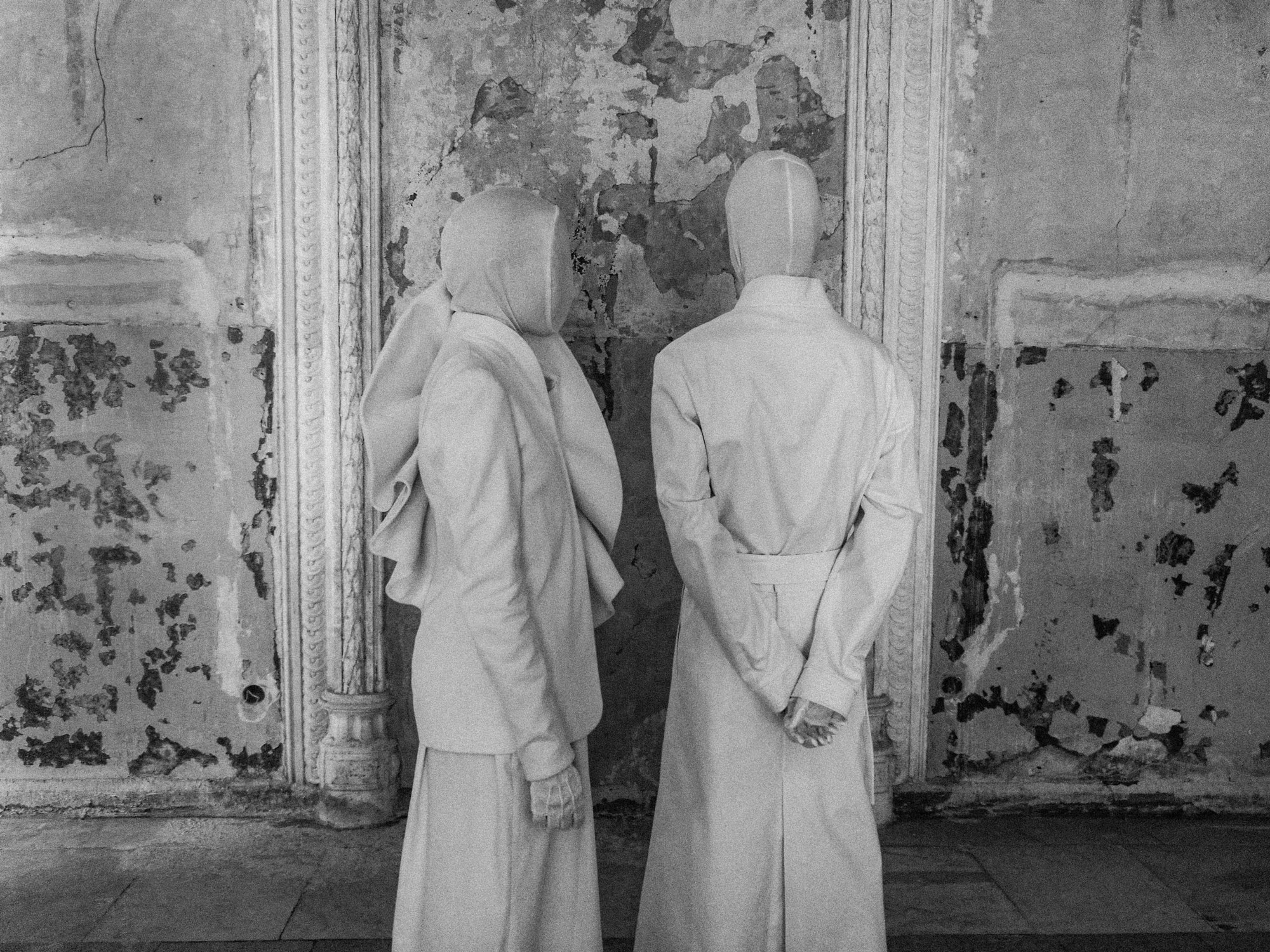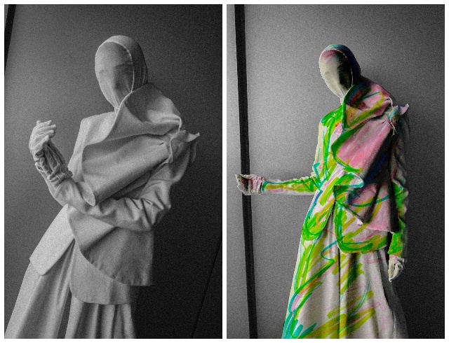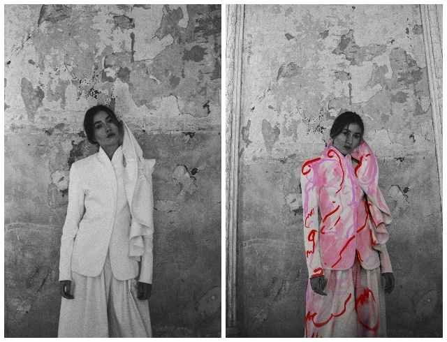 Для проекта FINCH создали два гендерно-нейтральных белых образа, как два пустых холста: кутюрный жакет с асимметричным крылом и брюки палаццо для девушки, а также платье, созданное на основе кимоно и килта, для парня. Оба образа дополняли белые балаклавы-маски, перчатки и носки таби. Оставаясь обезличенными и обесцвеченными, герои раскрывали истории своих внутренних переживаний через рисунок, который создавала поверх них Марианна во время перформанса.