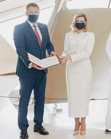 Свой безупречный наряд Зеленская дополнила бежевыми лодочками на шпильке и минималистичными серьгам. Волосы первой леди были элегантно уложены набок, а на лице красовался идеальный повседневный макияж.