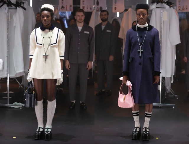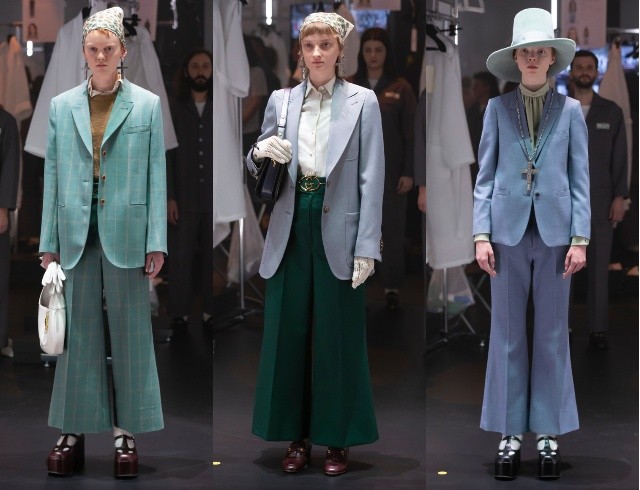 Коллекция выполнена в лучших традициях Gucci: брючные костюмы с широкими брюками и экстремально высокой посадкой, жакеты в клетку и твидовые костюмы по мотивам Джеки Кеннеди.