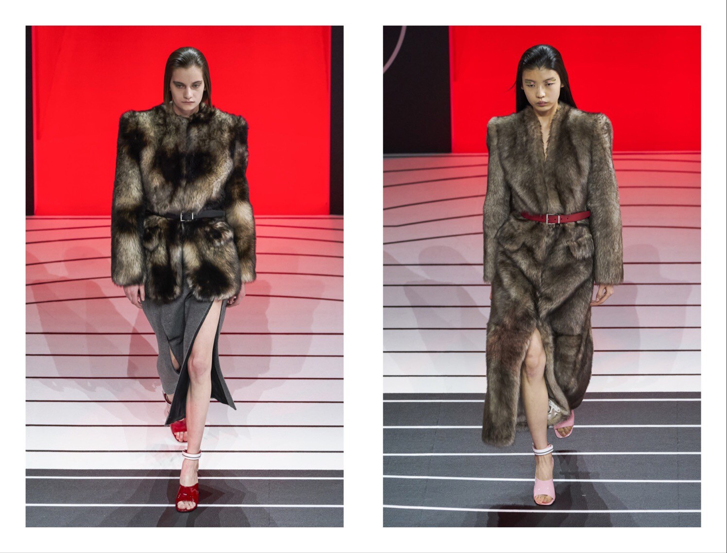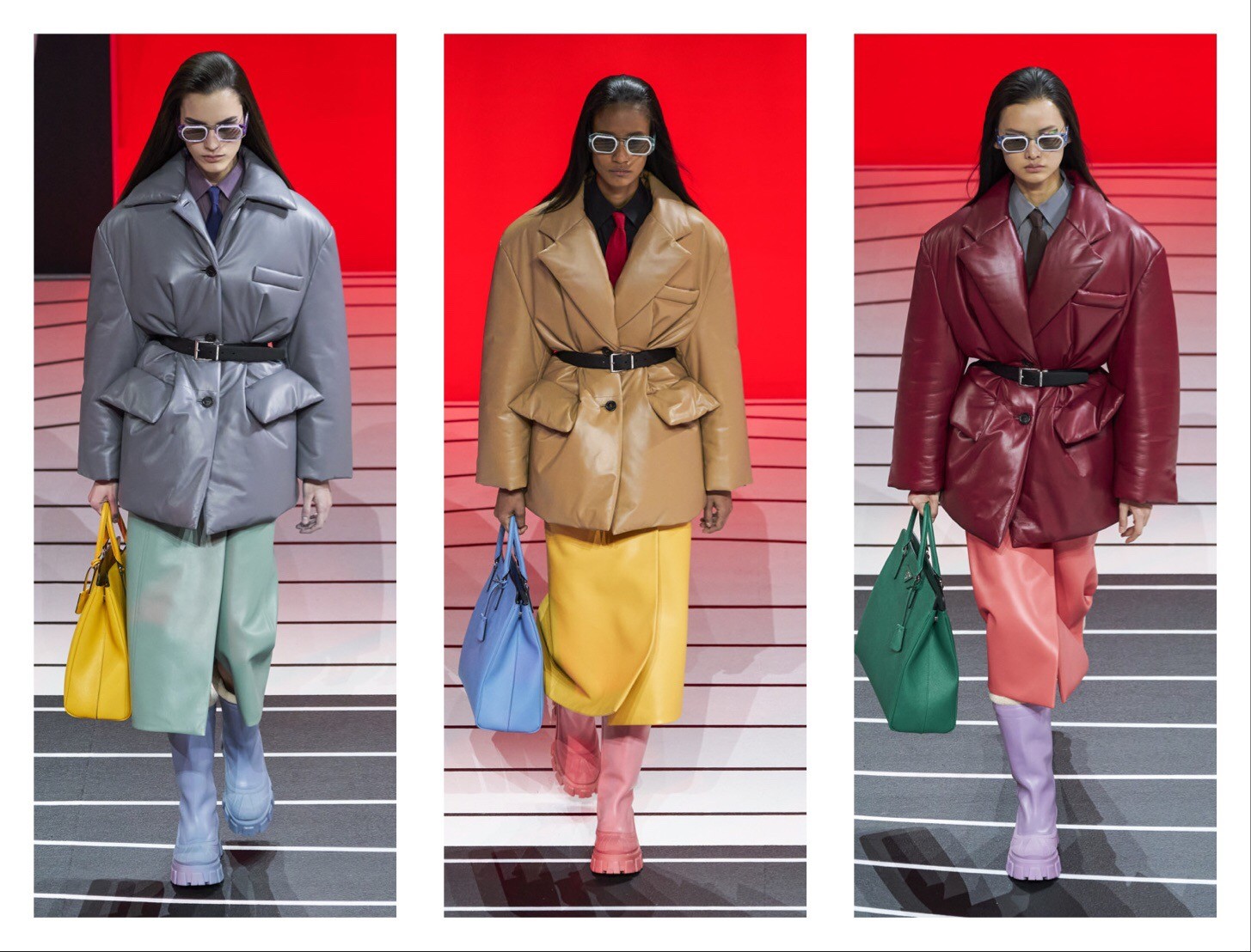 Обратите внимание на то, как конфетно-ягодные оттенки смягчают довольно угловатые линии и добавляют нежности там, где все слишком серьезно. А вот культовый силуэт — песочные часы, создавался при помощи ремней на талии и суперобъемных изделий.