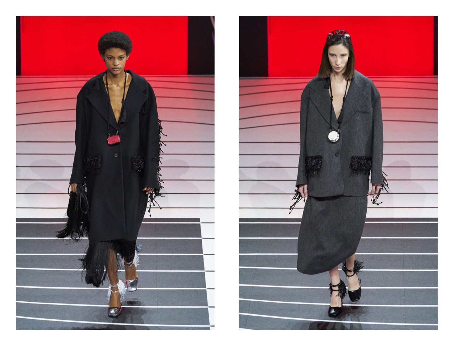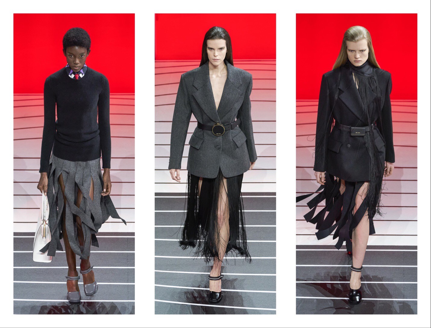 Проходило грандиозное шоу в не менее грандиозном зале Deposito, который является частью комплекса Fondazione Prada. Гостей размещали на трибунах, словно зрителей в театре. Модели появлялись из ниоткуда и неожиданно исчезали, невесомо двигаясь по огромному пространству, в центре которого возвеличивалась статуя Атласа, который по легенде поддерживал небеса. Весьма необычное место для того, чтобы продемонстрировать гламур и чувственность.