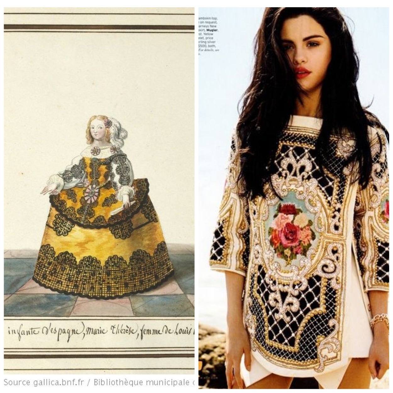 Справа мы видим на певице Селене Гомес платье от Balmain (2012 год). Здесь я увидела прямые отсылки к барокко.