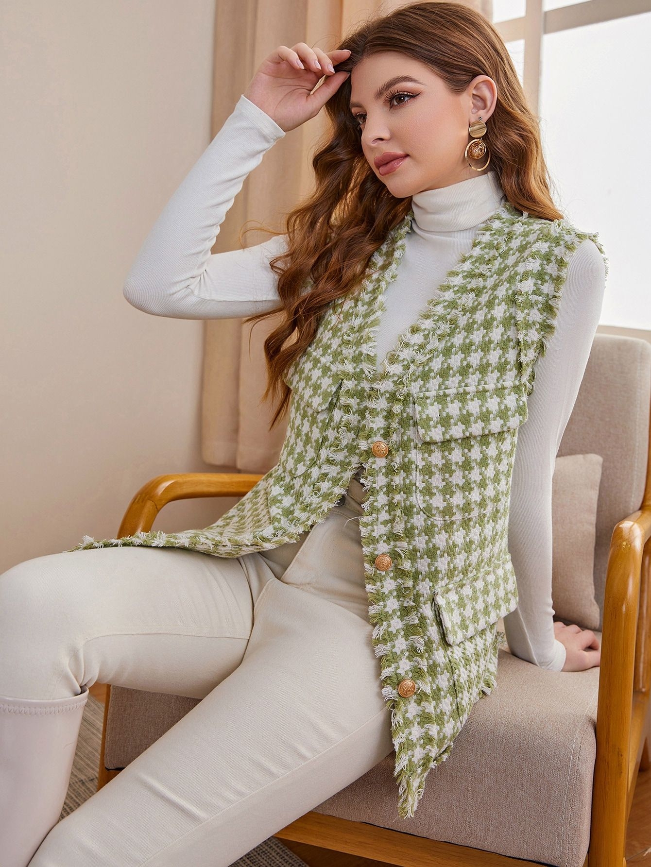 Жакеты и кофточки с принтом "гусиные лапки" выглядят нежно, стильно и одновременно уютно. К ним подходят и брюки, и джинсы, и различные юбки. Это же касается и обуви.