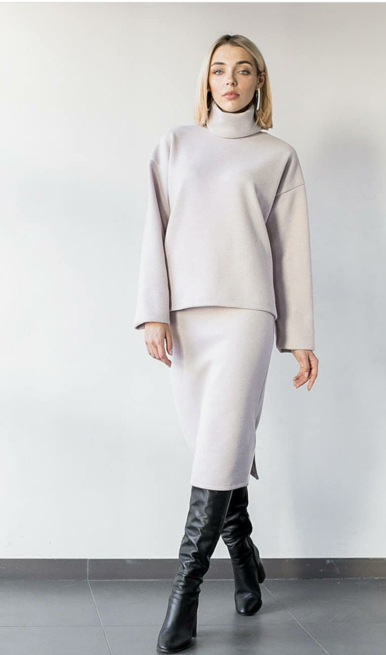 Они ничем не уступают свитеру и джинсам, наоборот это, как и пальто — демисезонно, стильно и практично. Конечно, лучше выбирать костюмы с утепленный составом. Говоря о цвете, нужно помнить, что хорошей базой будет серый, черный, молочный, бежевые цвета. Костюм может быть как в брючном тандеме, так и с юбкой длины миди.