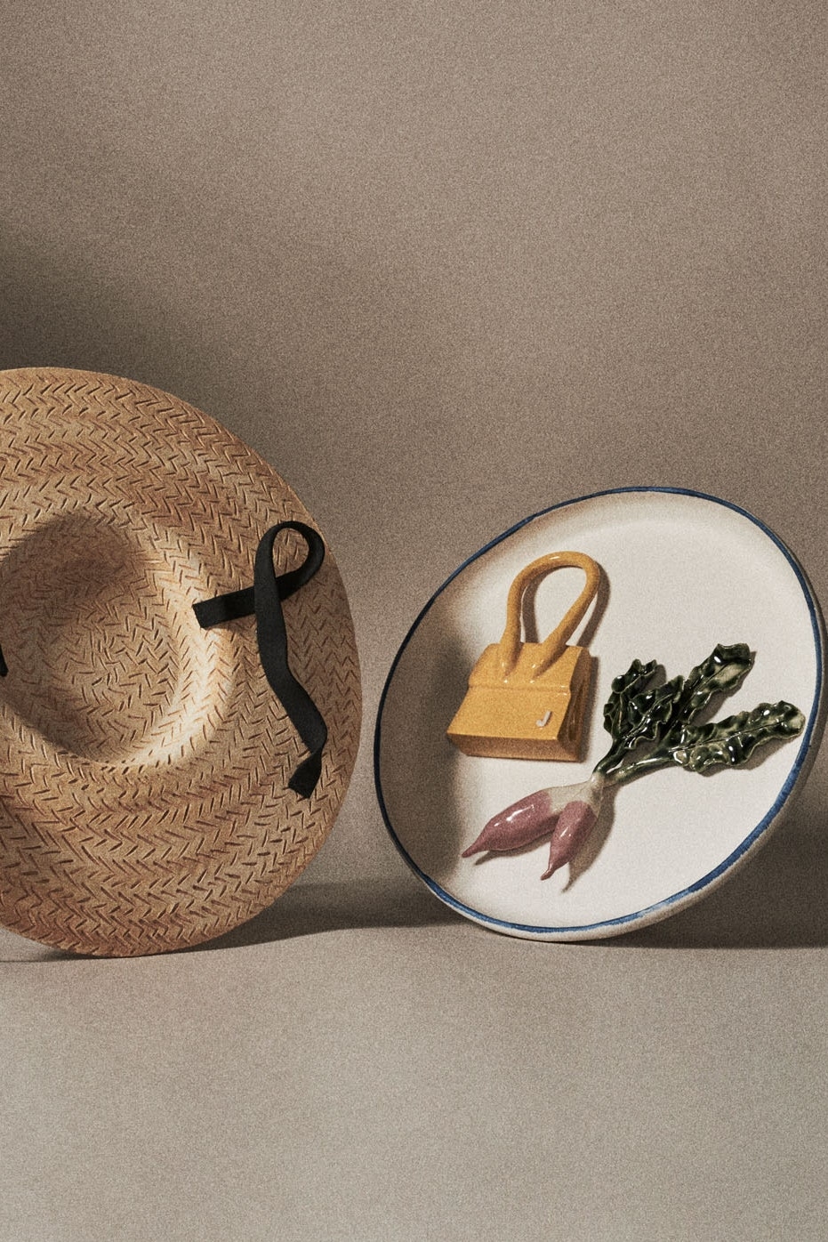 В коллаборацию вошло 5 тарелок, которые художница расписала вручную. Модная посуда повторяет бестселлеры бренда: желтую микро-сумку Le Chiquito, асимметричные серьги и соломенную шляпу.