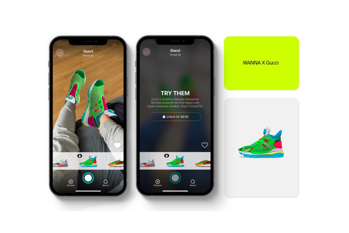 Модный Дом Gucci и белорусский AR-бренд Wanna представили свое первое совместное творение — виртуальные кроссовки ярко-зеленого цвета с розовыми и голубыми элементами.