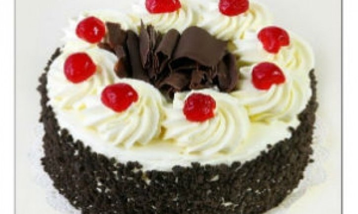 Торт смажьте взбитыми сливками, посыпьте шоколадом и украсьте вишней.