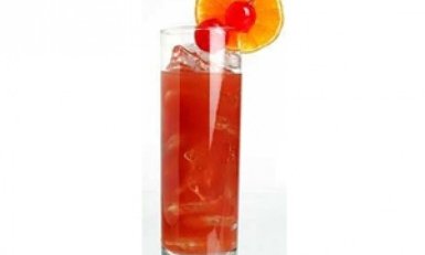 Налейте все ингредиенты в шейкер со льдом. Хорошо потрясите и вылейте в высокий стакан. Украсьте долькой апельсина и коктейльной вишней.